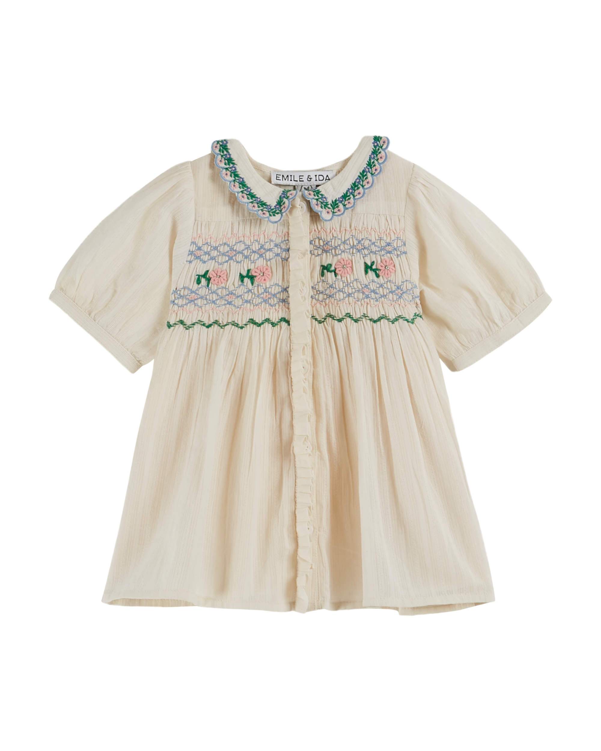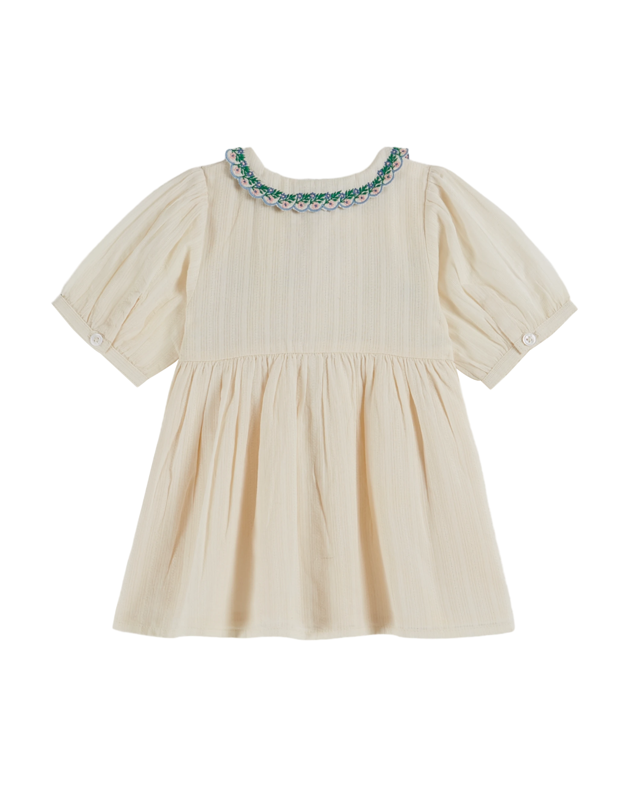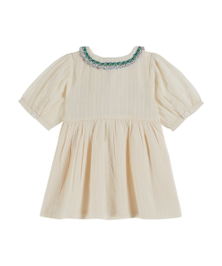 Dress in ecru cotton, crafted in a superb fabric with fine stripes. A magnificent piece in which the fabric harmonizes perfectly with the delicacy of the smocks, handmade by Indian artisans. Balloon sleeves, finished with a button cuff, and a flat scalloped collar embroidered with foliate scrolls add a vintage touch. The button placket opens all the way up, with natural mother-of-pearl buttons concealed beneath a frilly ruffle. The dress is fully lined and assembled with French seam.