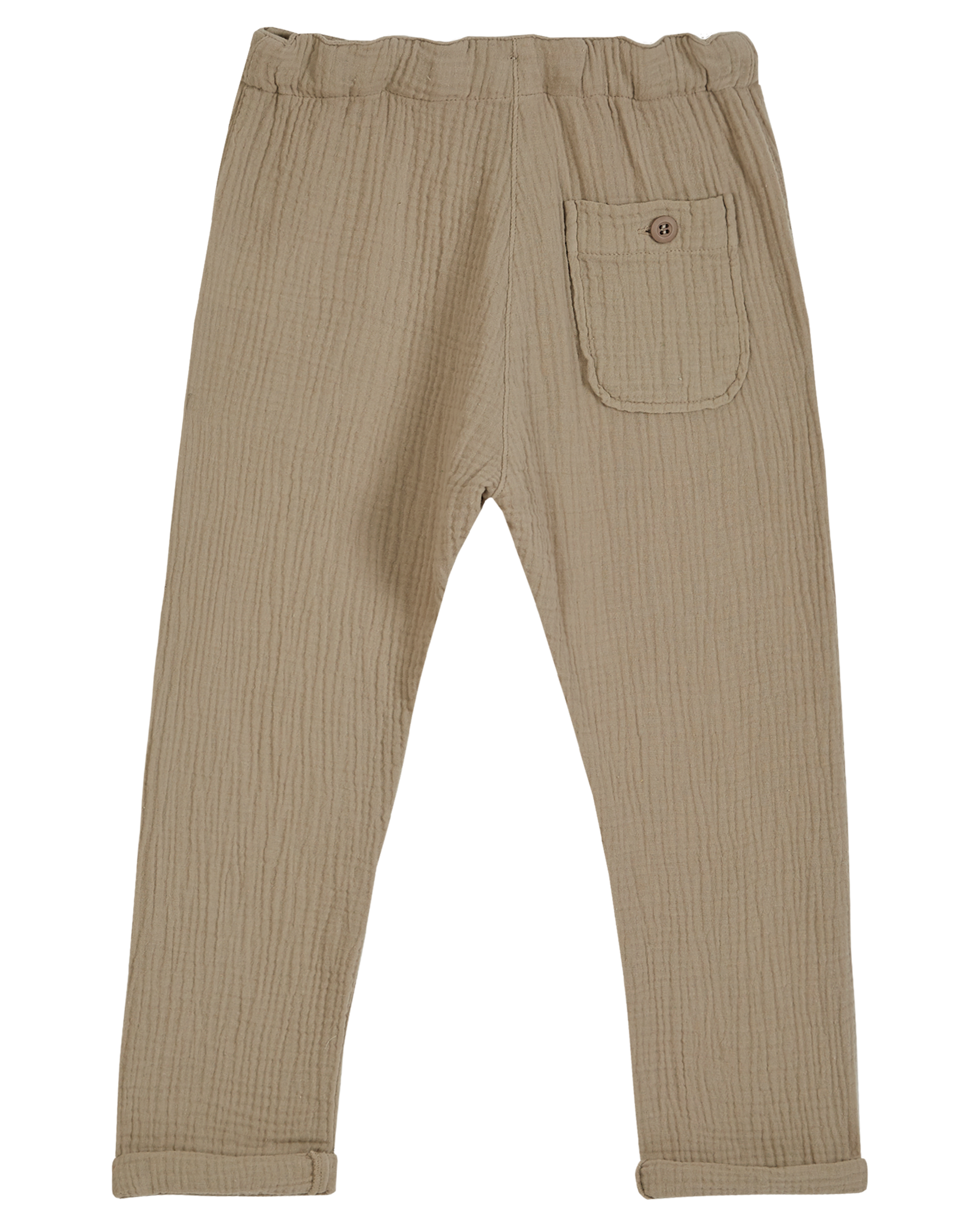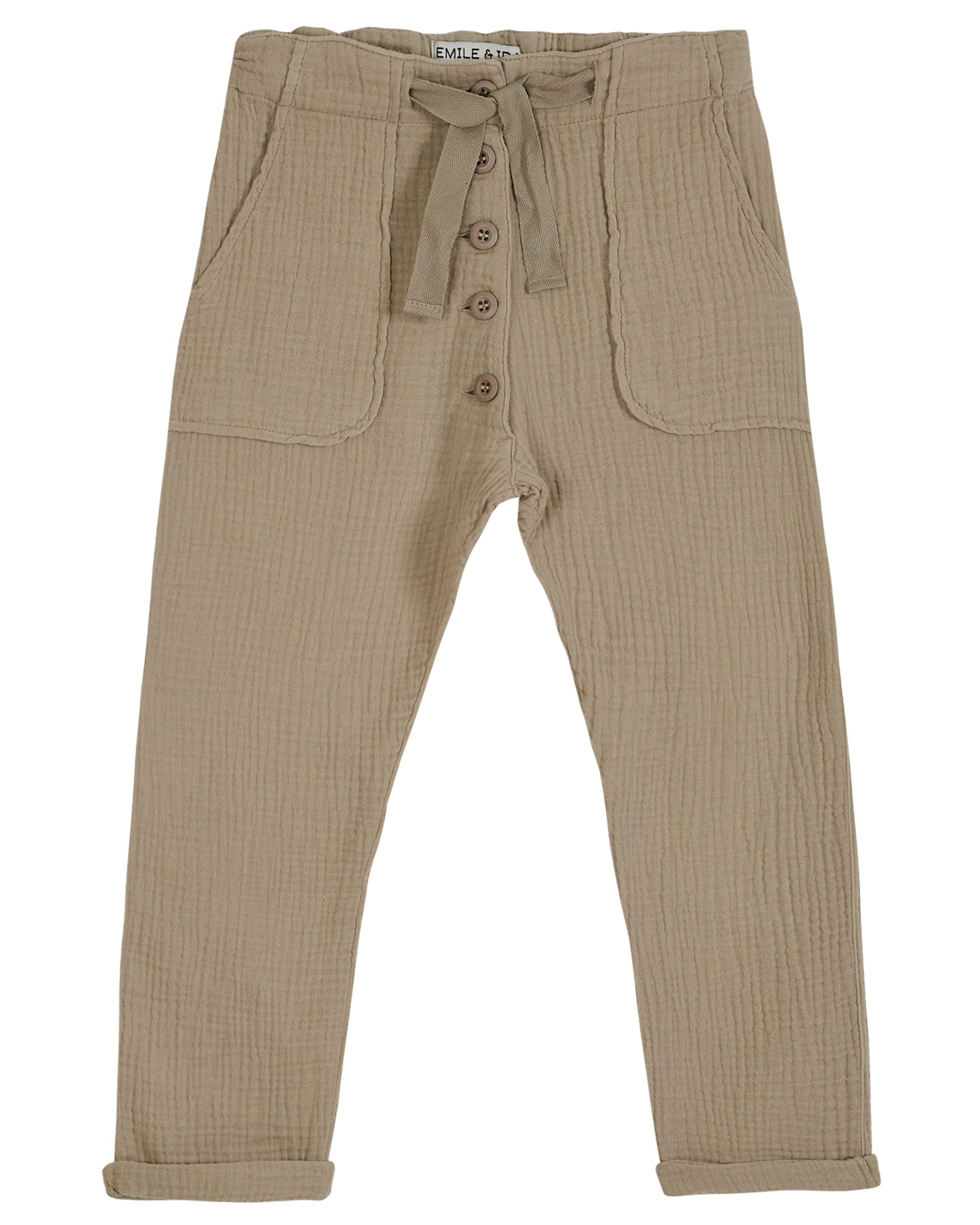 Pants in mastic-beige double cotton gauze. The sarouel shape, the soft, flowing, easy-care fabric, the button fly and the adjustable elasticated waistband with tonal cotton twill tie, make these pants a basic in the Emile et Ida wardrobe, popular for some years now. In addition to two front patch pockets, they also have a buttoned patch pocket on the back.