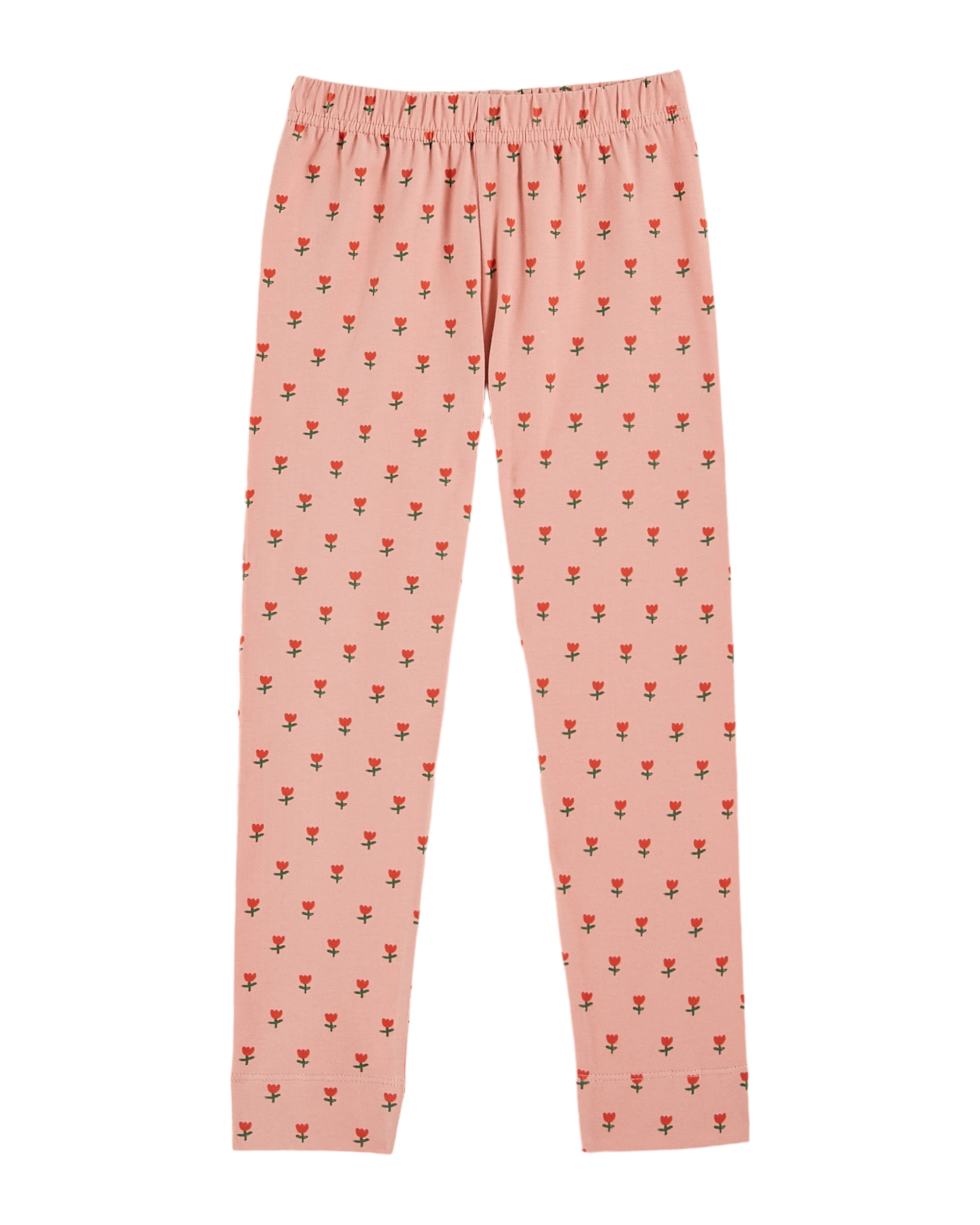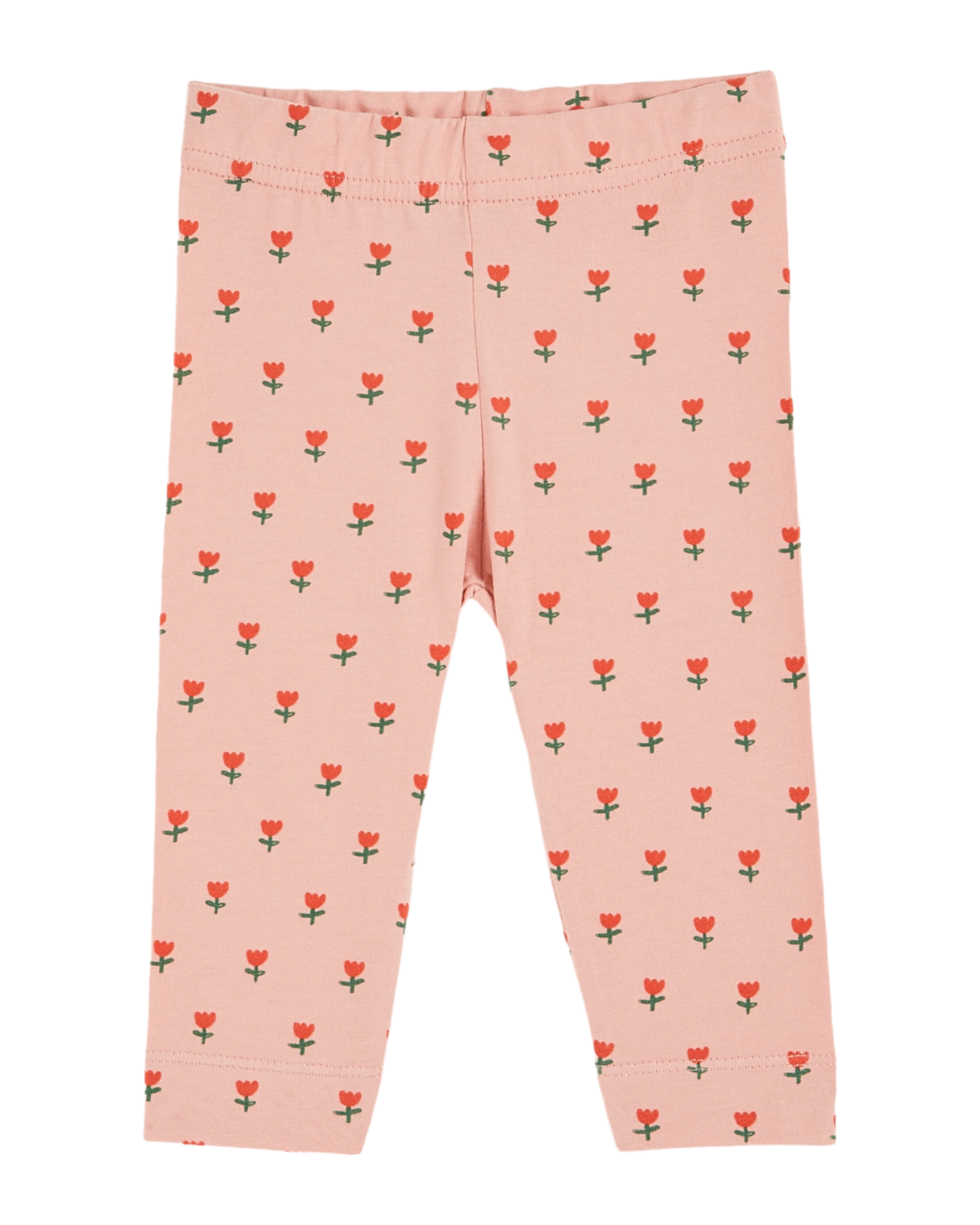Cotton and elastane jersey leggings sown with vermilion-red tulips on a pink background. With its elasticated waistband and soft organic fabric, these leggings are an original basic that goes with any outfit.