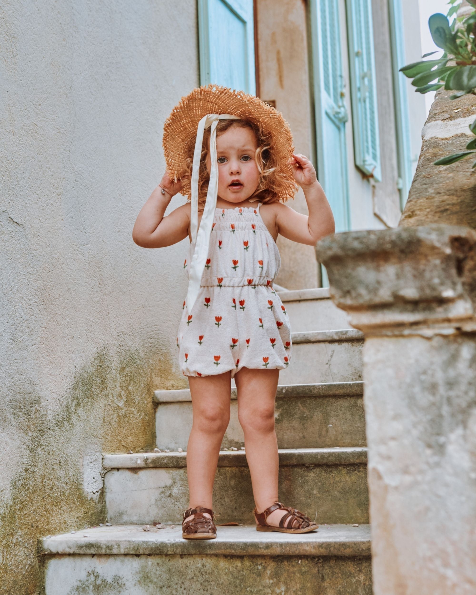 Off-white terry short jumpsuit, adorned with vermilion-red tulips. Crafted in ultra-soft, plush and stretchy terry velvet, it offers unrivaled comfort. This combibshort features an elasticated waistband to ensure the bloomer stays securely in place, and spaghetti straps designed to limit shadow marks. The thighband is also elasticated, while the bustline is delicately bubbled thanks to three lines of stretch yarn.