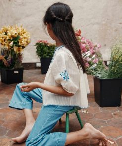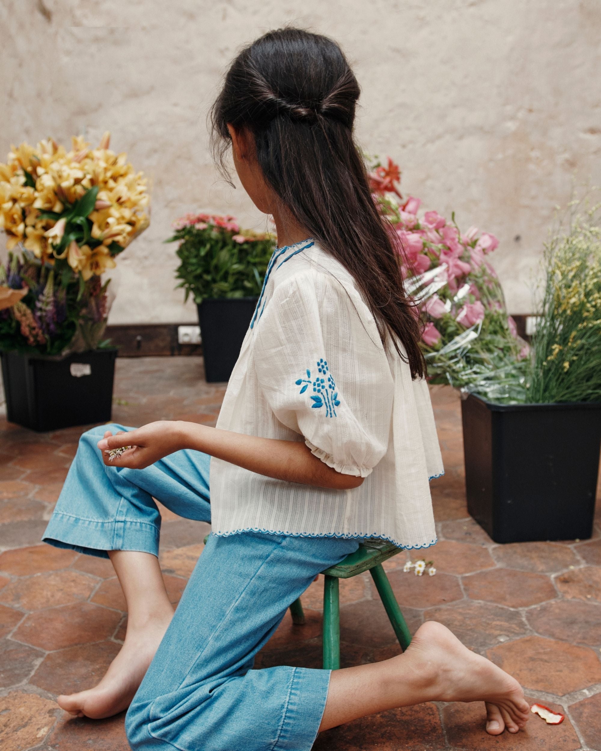 Ecru cotton blouse. Round neckline with scallops edged in blue satin stitch, balloon sleeves elasticated at the hem, lined yoke supporting the gathers of the bodice which give fullness. The bottom of the blouse is scalloped, as is the neckline. On the yoke, recumbent pleats are highlighted with croquet, and a hand-embroidered flower takes center stage. A blue embroidered bouquet adorns the upper sleeves. The small button placket closes at the back with natural mother-of-pearl buttons.