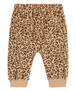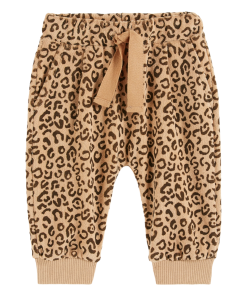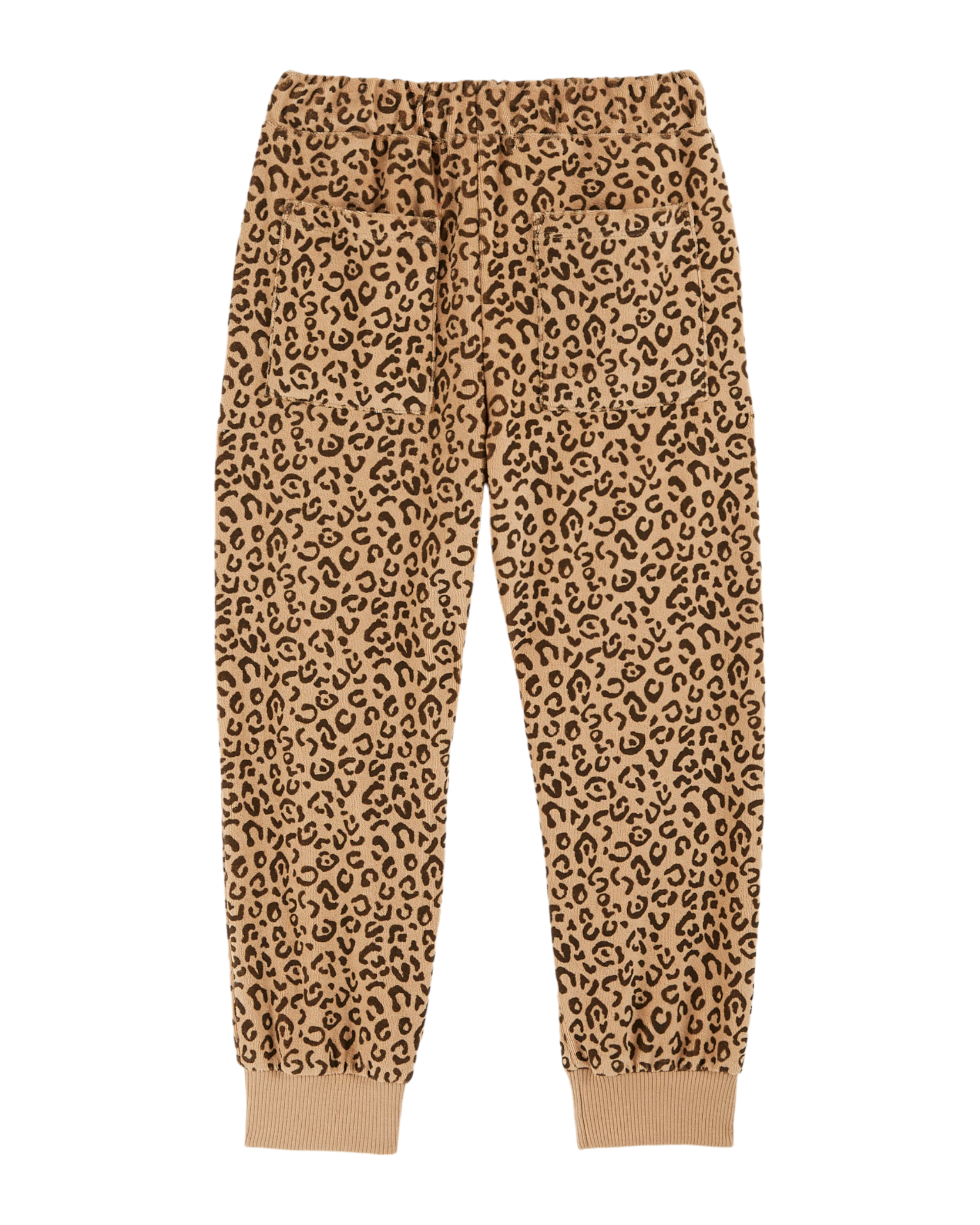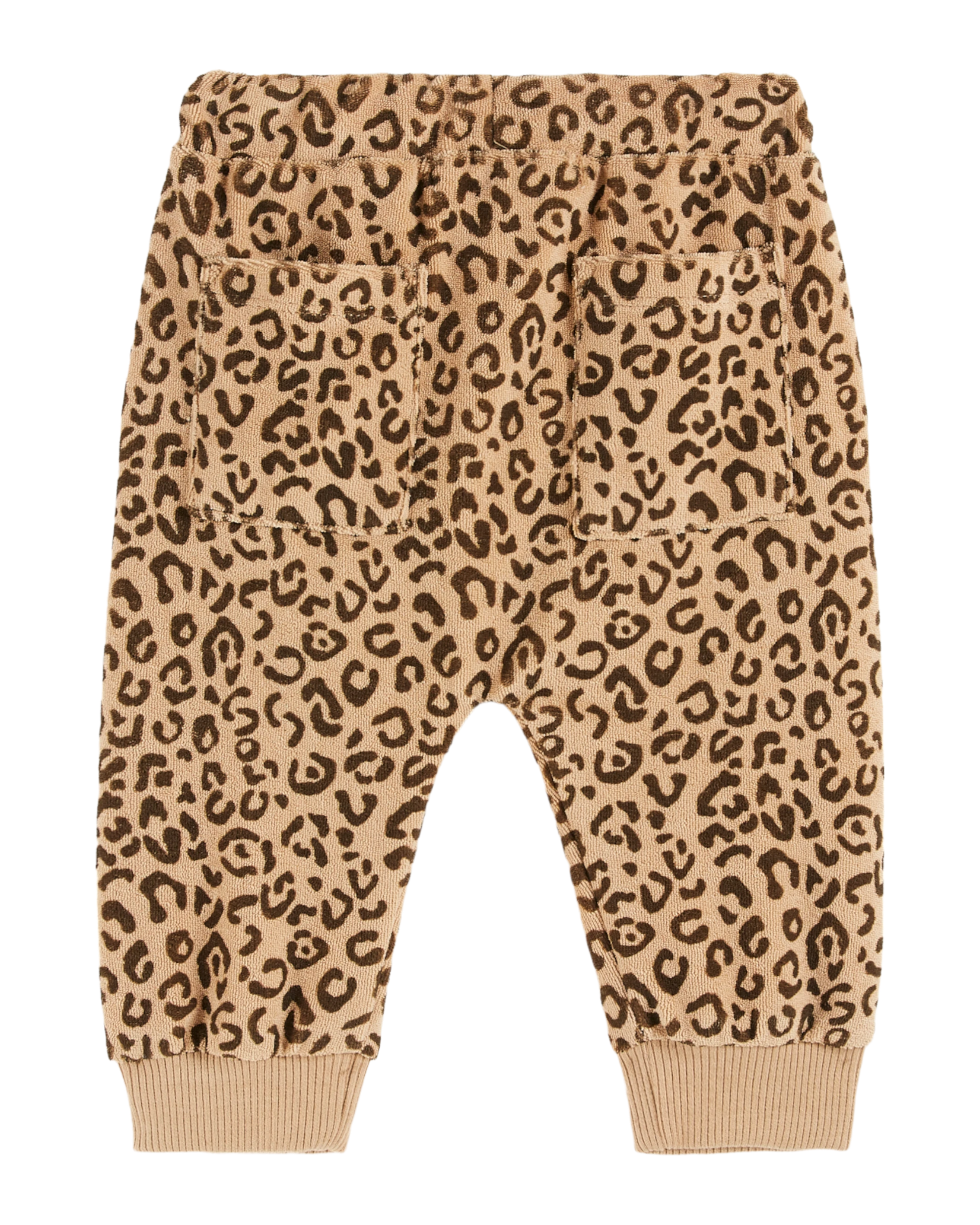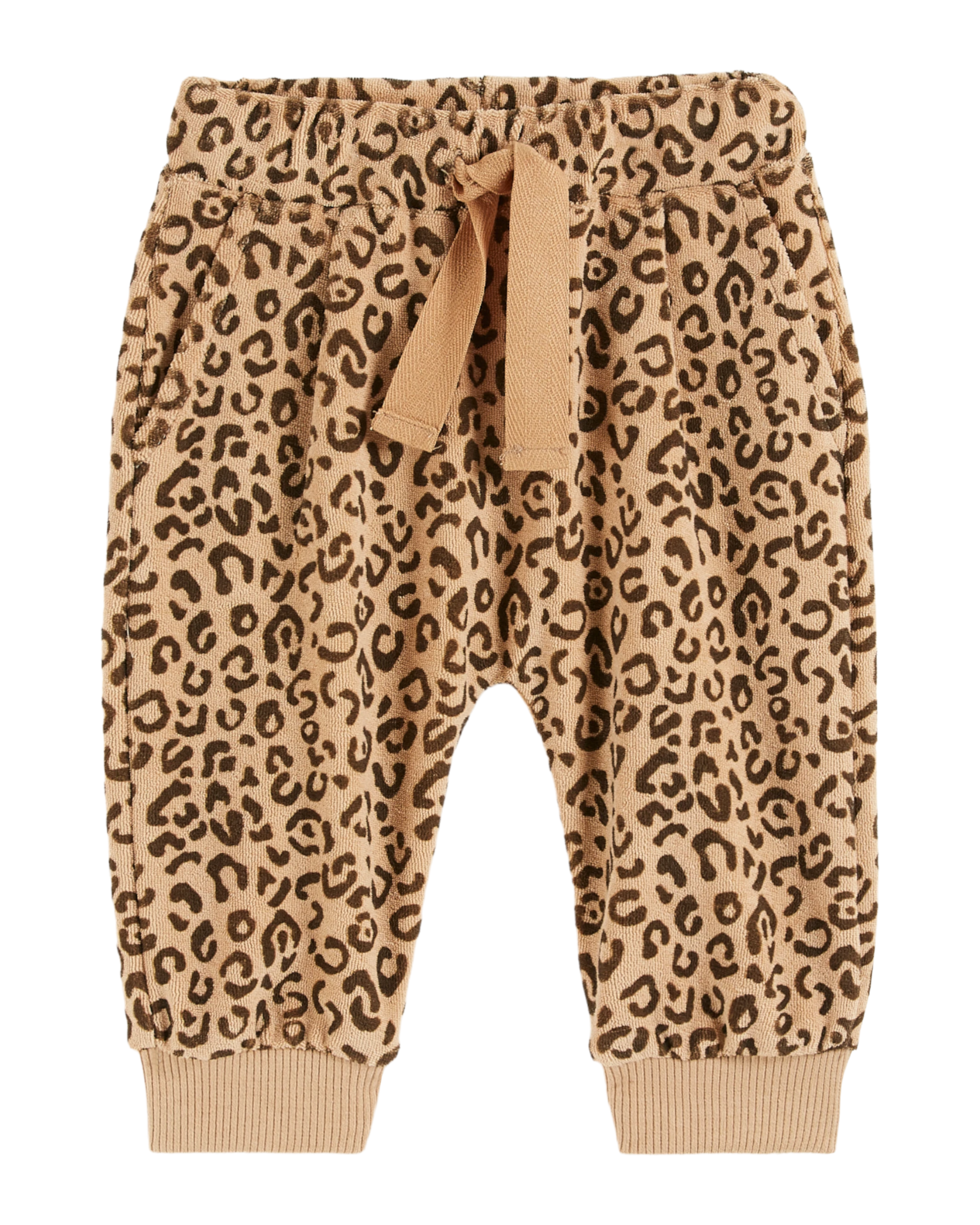 Jogger in caramel terry, on which a leopard has left its stains. With its soft, plush and comfortable terry velor, its elasticated waistband adjustable to all sizes thanks to a caramel twill tie, its toned-in ribbing at the ankles and its two Italian pockets, these pants are a must-have basic in any boy’s wardrobe.