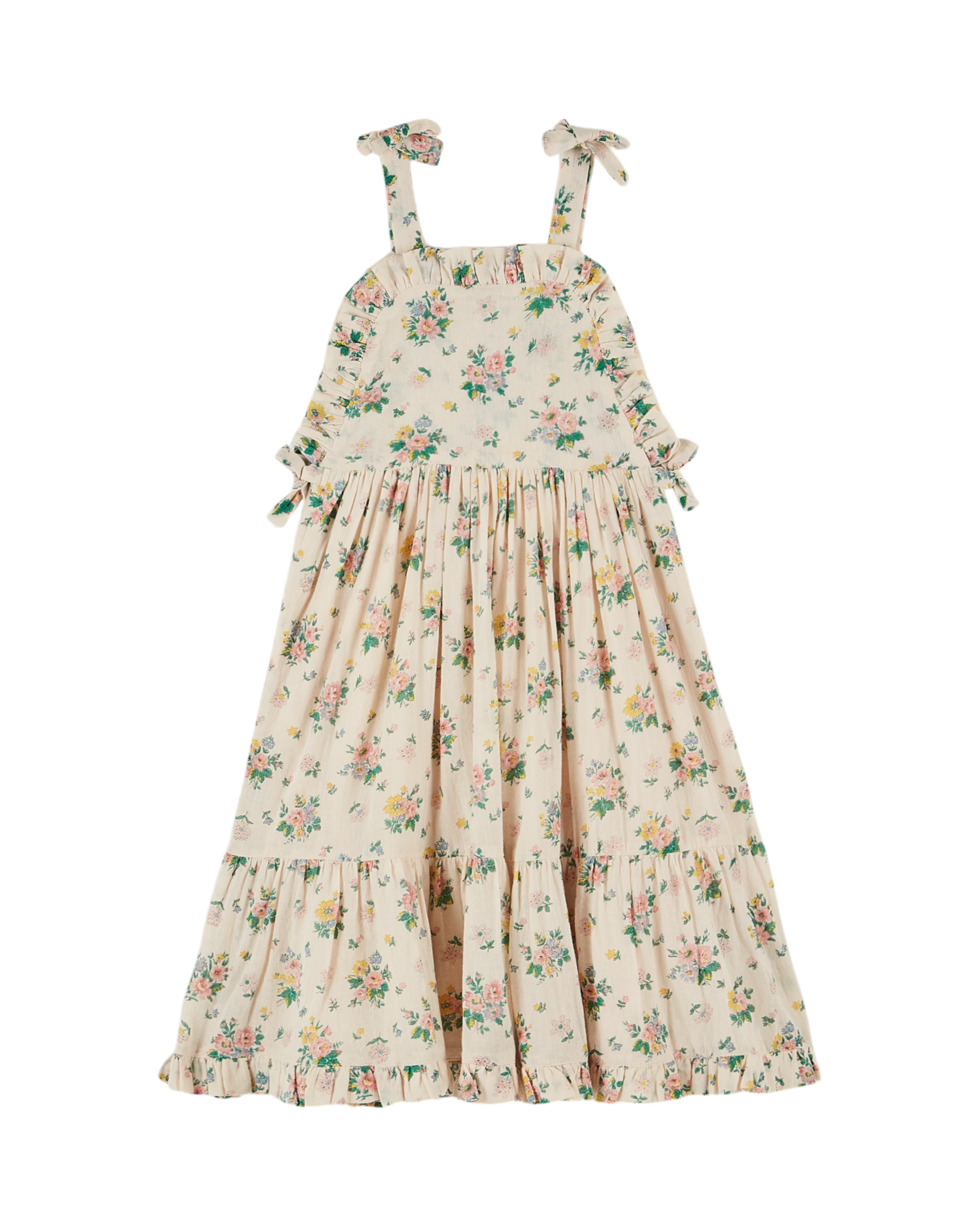 Powder-beige cotton dress dotted with bouquets of soft flowers. The bodice of this dress resembles dungaree bibs held in place by shoulder straps. The gathers of the skirt are supported by the bibs and give fullness to the skirt finished with a large and then a small flounce. Almost like the dungarees, the sides are fastened with gnarls instead of buttons.