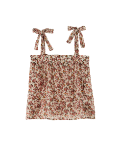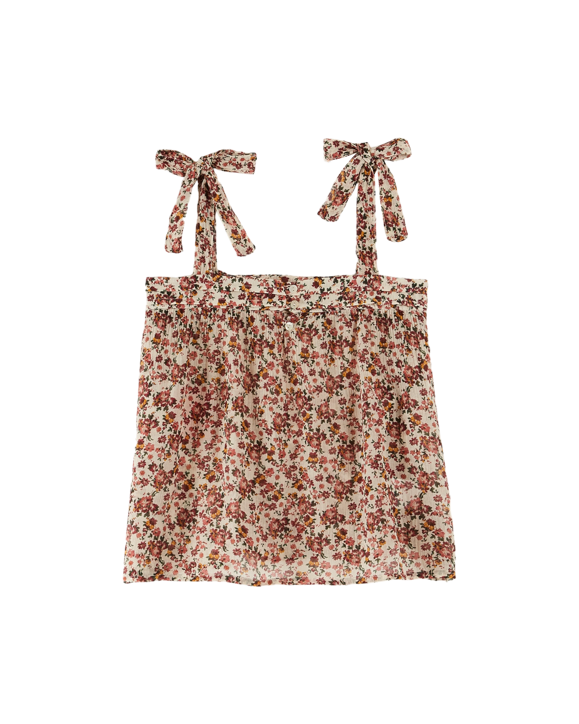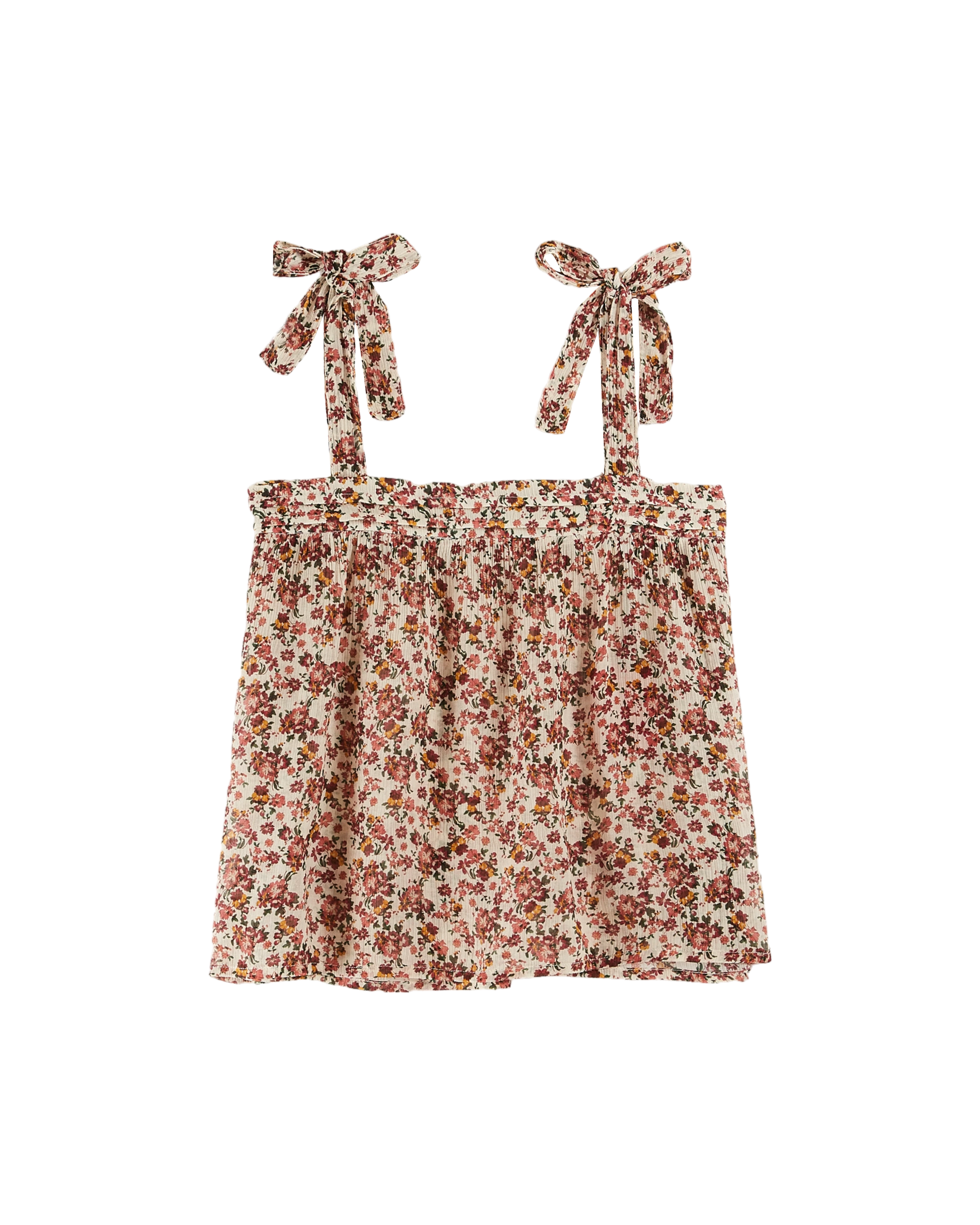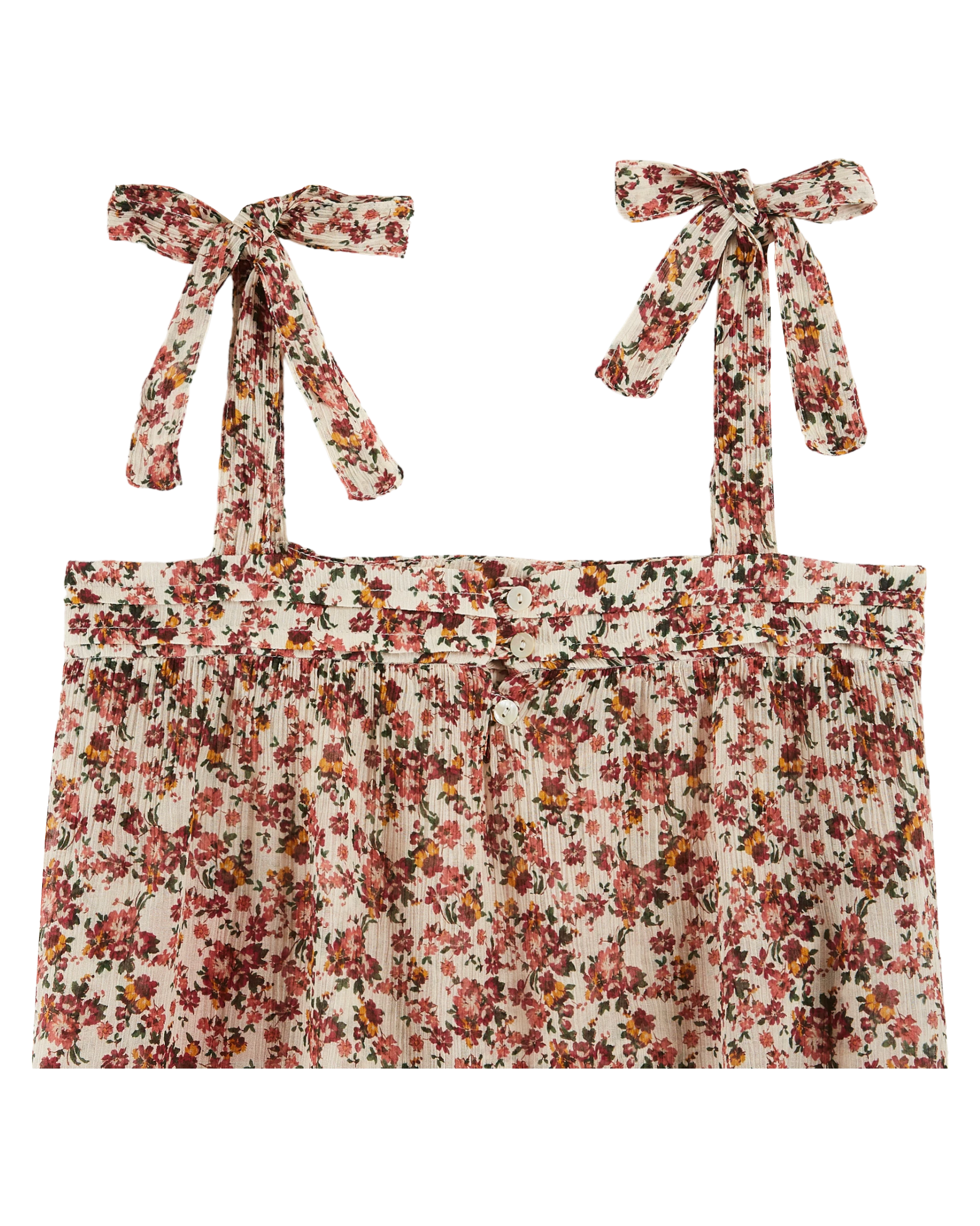 Top in an ecru cotton and silk creponné blend, adorned with dark pink flowers illuminated by a few touches of yellow. This soft, flowing, lightweight fabric wrinkles very little. Embellish with shoulder straps to adjust the height of the camisole and add two pleats on the finishing band around the bust. All the ingredients are there for a perfect top.